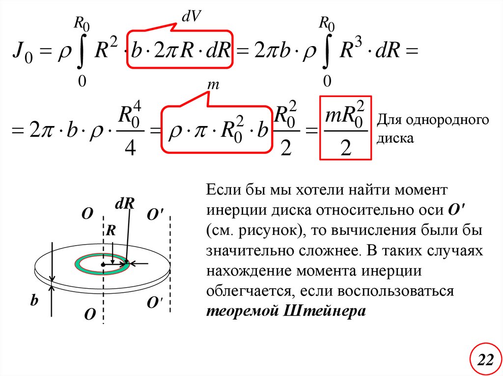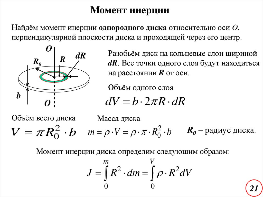 Момент инерцииНайдём момент инерции однородного диска относительно оси O,