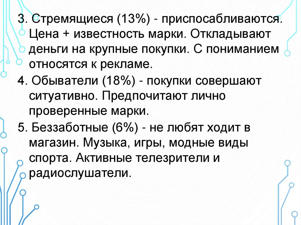 3. Стремящиеся (13%) - приспосабливаются.Цена + известность марки. Откладывают