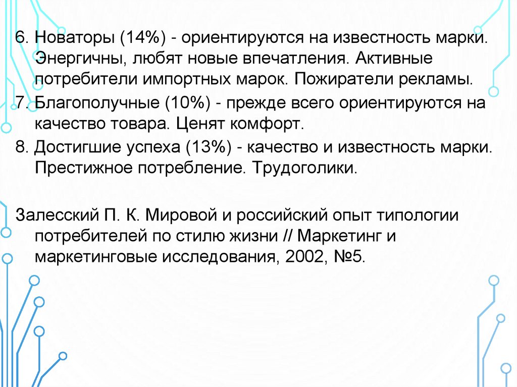 6. Новаторы (14%) - ориентируются на известность марки.Энергичны, любят новые впечатления. Активные