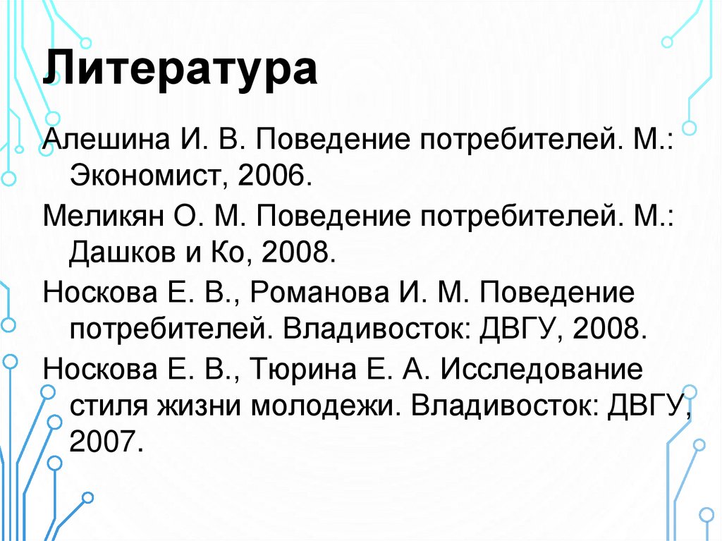 ЛитератураАлешина И. В. Поведение потребителей. М.: