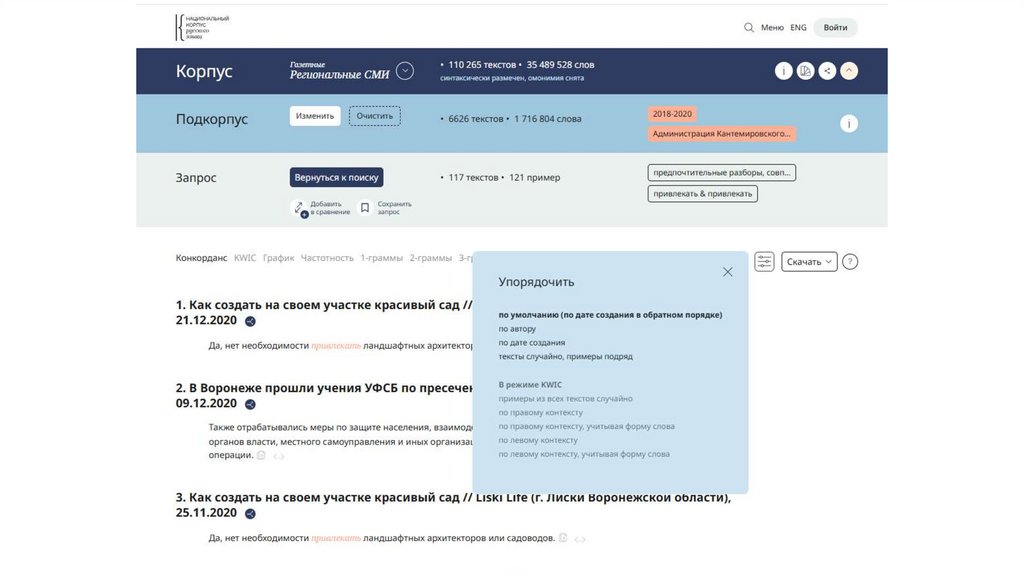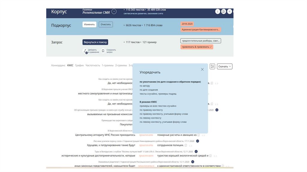 5. Познакомиться с разными режимами просмотра полученных результатов(Конкорданс, KWIC, таблицы n-граммов) и возможные варианты сортировки в