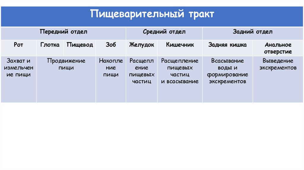 Пищеварительный тракт начинается ротовым отверстием, ведущим в ротовуюполость и далее — в глотку, пищевод, желудок, тонкую кишку и заднюю