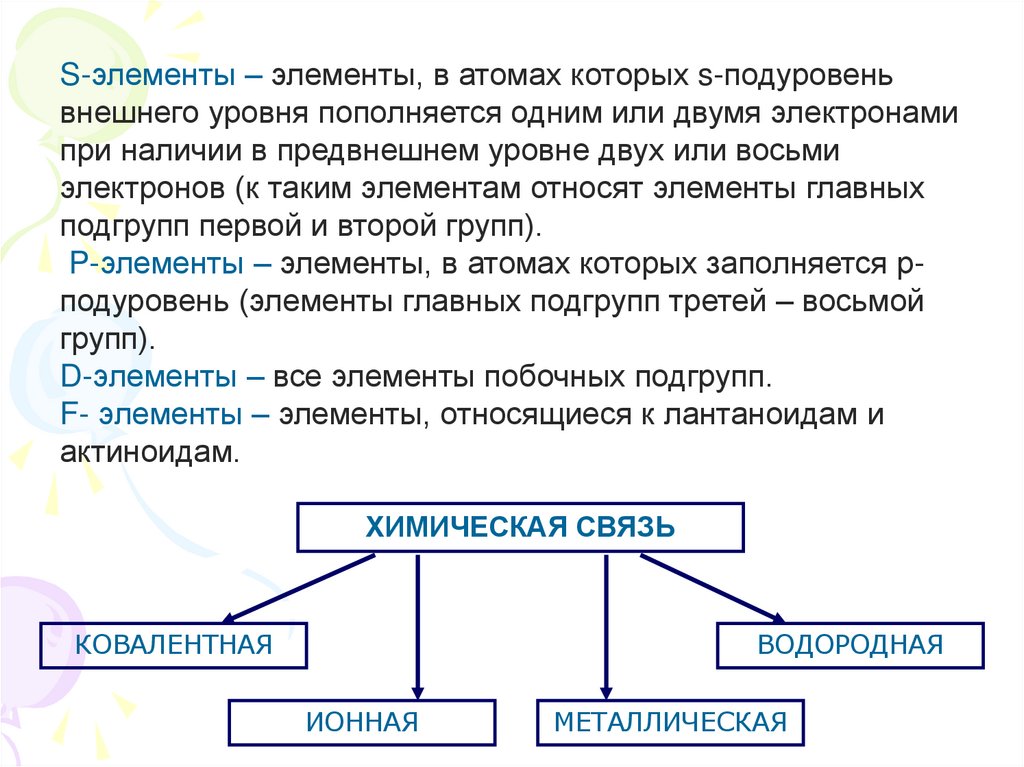 S-элементы – элементы, в атомах которых s-подуровеньвнешнего уровня пополняется одним или двумя электронами