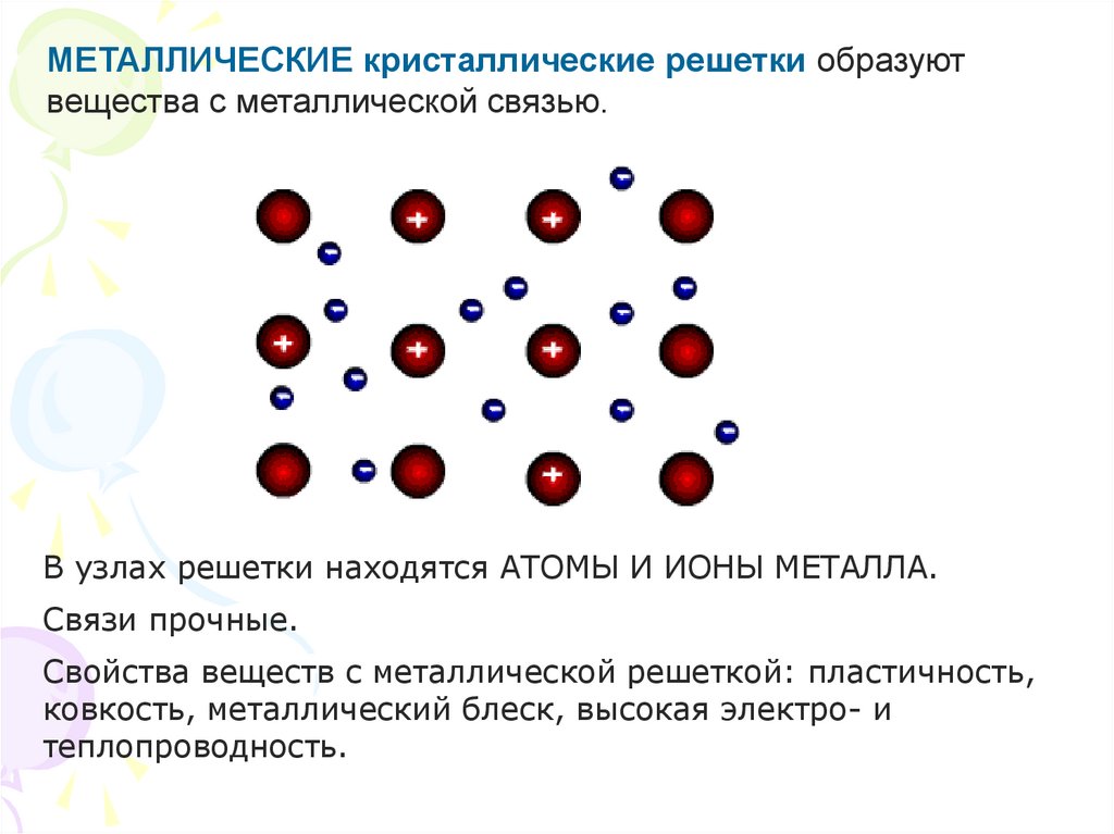 МЕТАЛЛИЧЕСКИЕ кристаллические решетки образуютвещества с металлической связью.