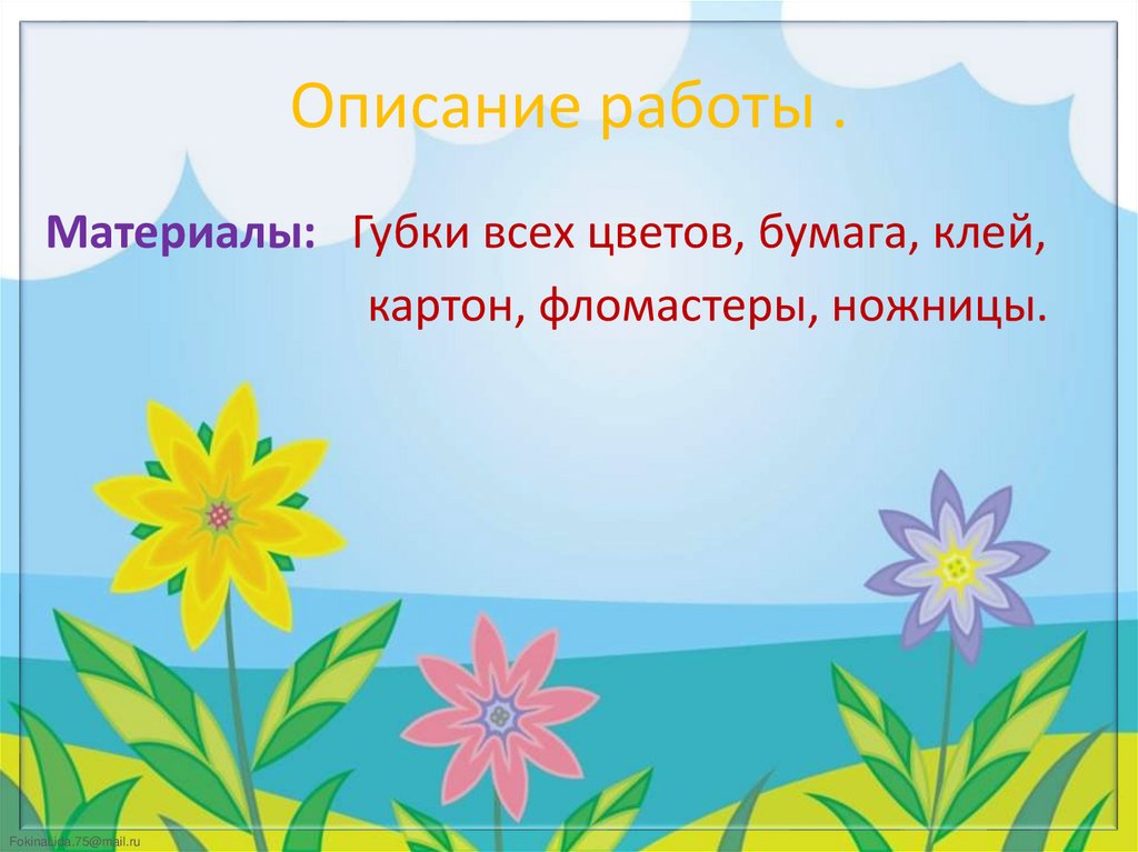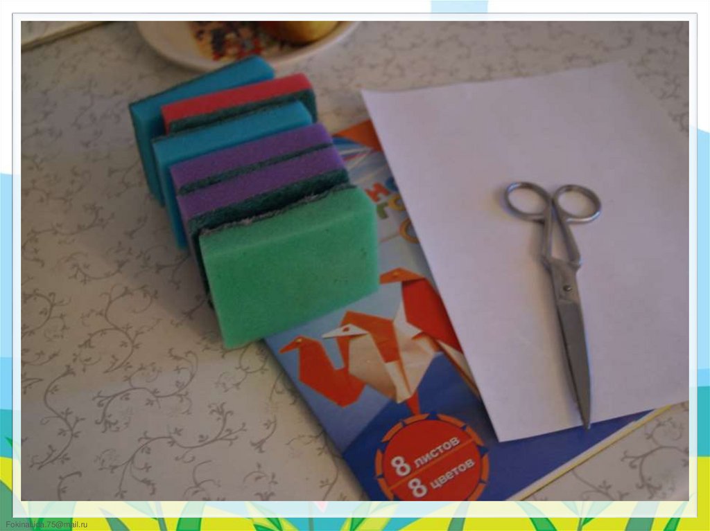 Материалы: Губки всех цветов, бумага, клей,картон, фломастеры, ножницы.