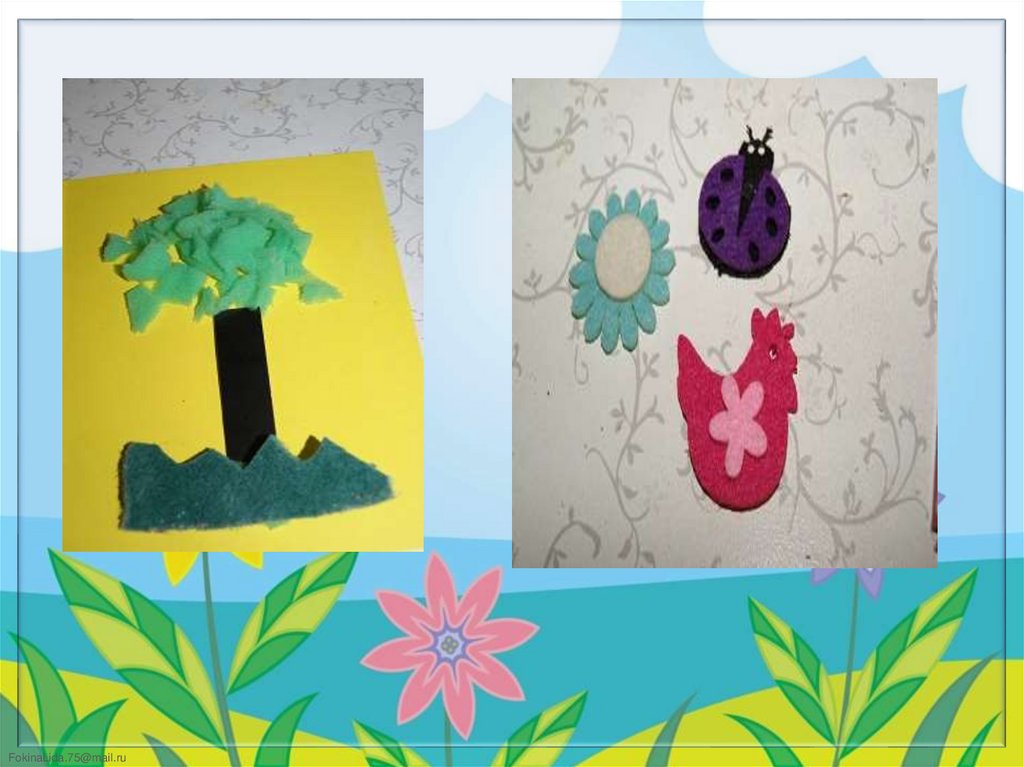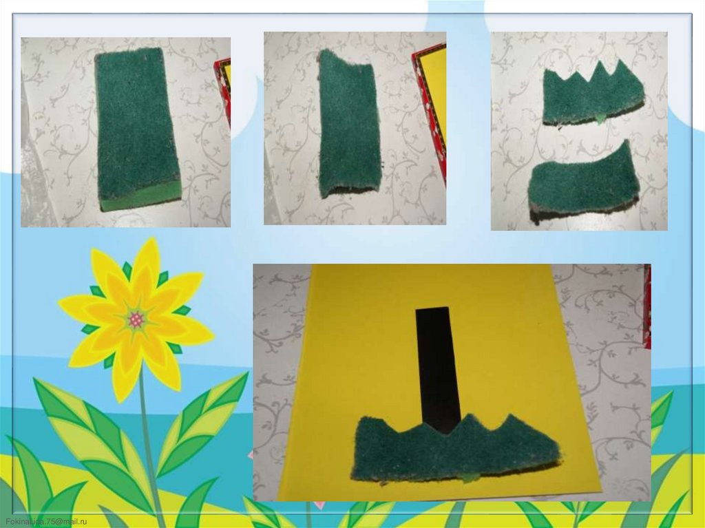 FokinaLida.75@mail.ru6. Сделав траву, всё приклеиваем.Далее приступаем к изготовлению листвы «чуда –дерева». Она может быть любого цвета , или смеси