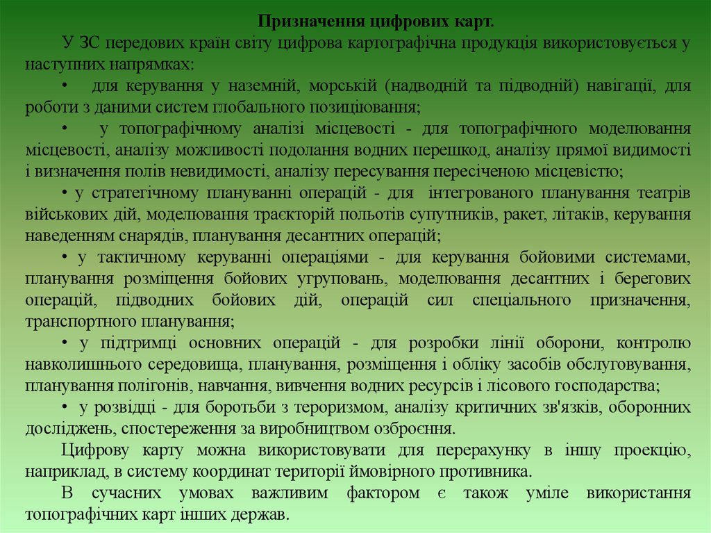 Призначення цифрових карт.У ЗС передових країн світу цифрова картографічна продукція використовується у