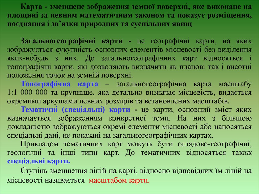 Карта - зменшене зображення земної поверхні, яке виконане наплощині за певним математичним законом та показує розміщення,