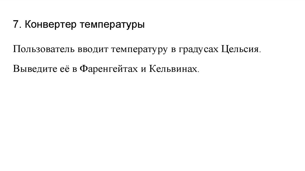7. Конвертер температурыПользователь вводит температуру в градусах Цельсия.