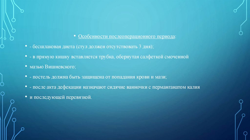 • Особенности послеоперационного периода:• - бесшлаковая диета (стул должен отсутствовать 3 дня);