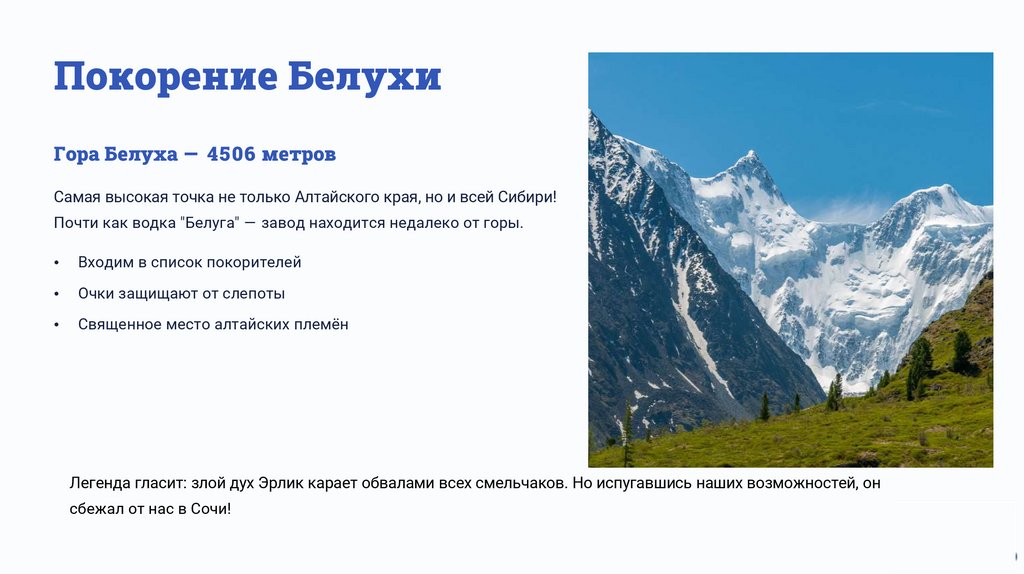 Легенда гласит: злой дух Эрлик карает обвалами всех смельчаков. Но испугавшись наших возможностей, он
