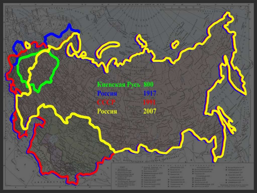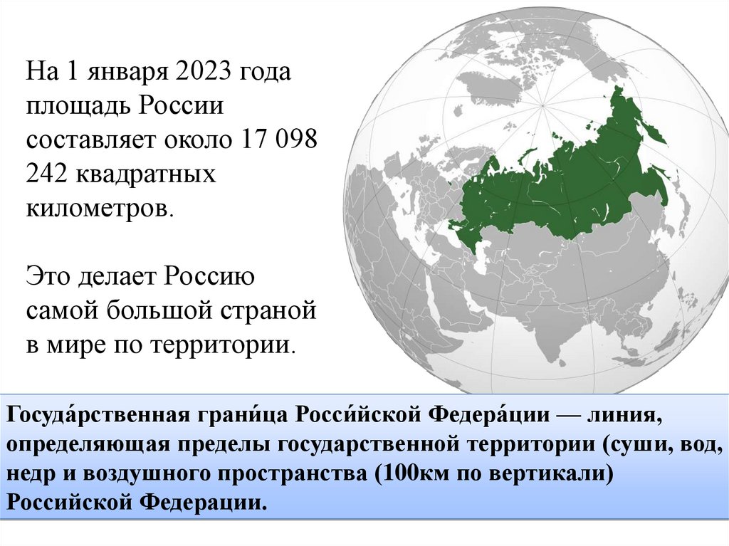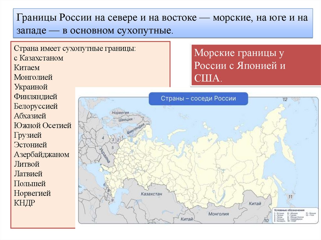 Границы России на севере и на востоке — морские, на юге и назападе — в основном сухопутные.