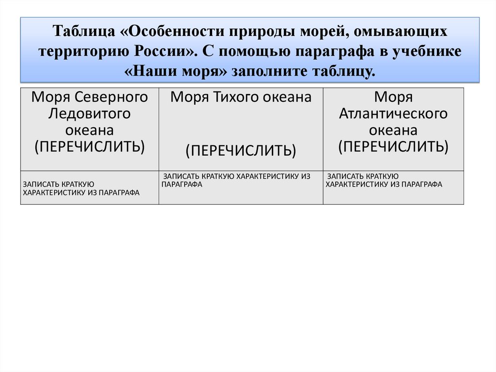 Таблица «Особенности природы морей, омывающихтерриторию России». С помощью параграфа в учебнике