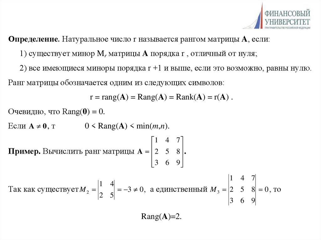нулю, а все миноры порядка r+1, его содержащие, равны нулю, то