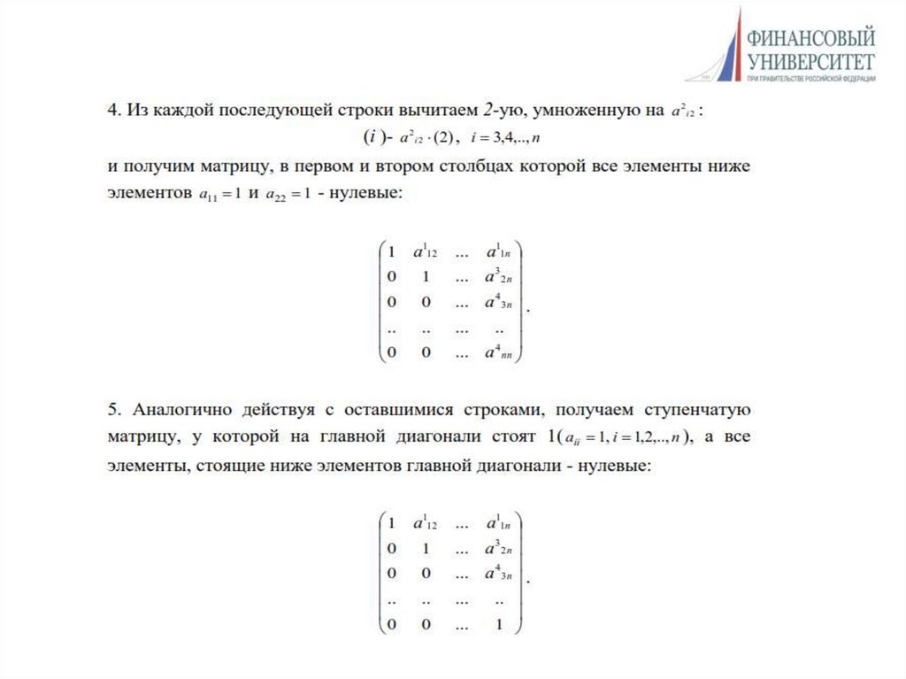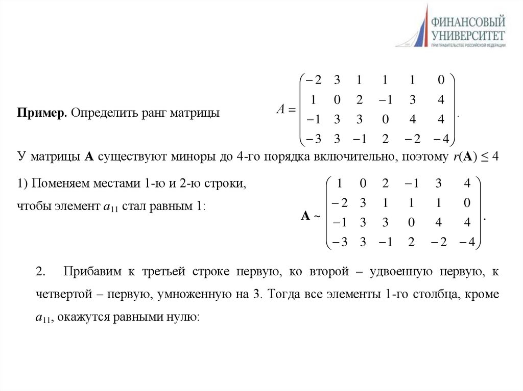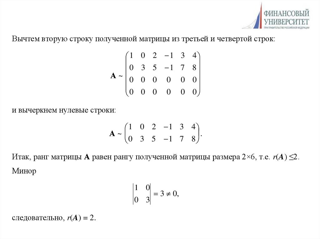 Итак, ранг матрицы А равен рангу полученной матрицы размера 2×6, т.е. r(A) ≤2.
