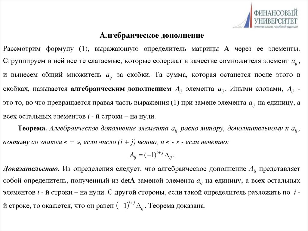 скобках, называется алгебраическим дополнением Aij элемента aij . Иными словами, Aij это то, во что превращается правая часть выражения (1) при замене элемента aij на единицу, а