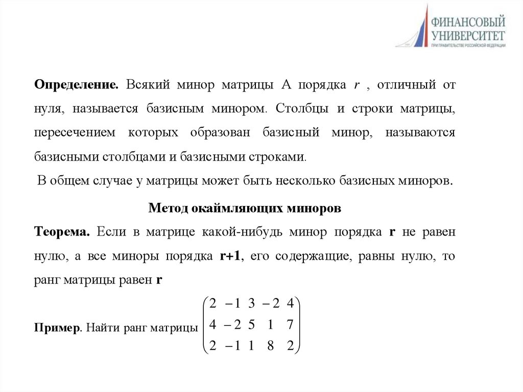 Определение. Всякий минор матрицы A порядка r , отличный отнуля, называется базисным минором. Столбцы и строки матрицы,