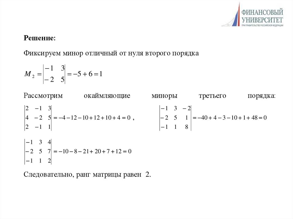 Решение:Фиксируем минор отличный от нуля второго порядка