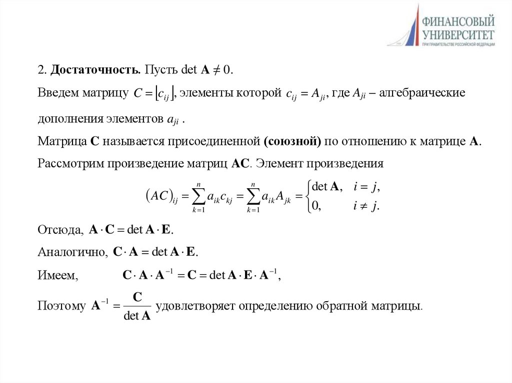 2. Достаточность. Пусть det A ≠ 0.Введем матрицу C cij , элементы которой cij A ji , где Aji – алгебраические