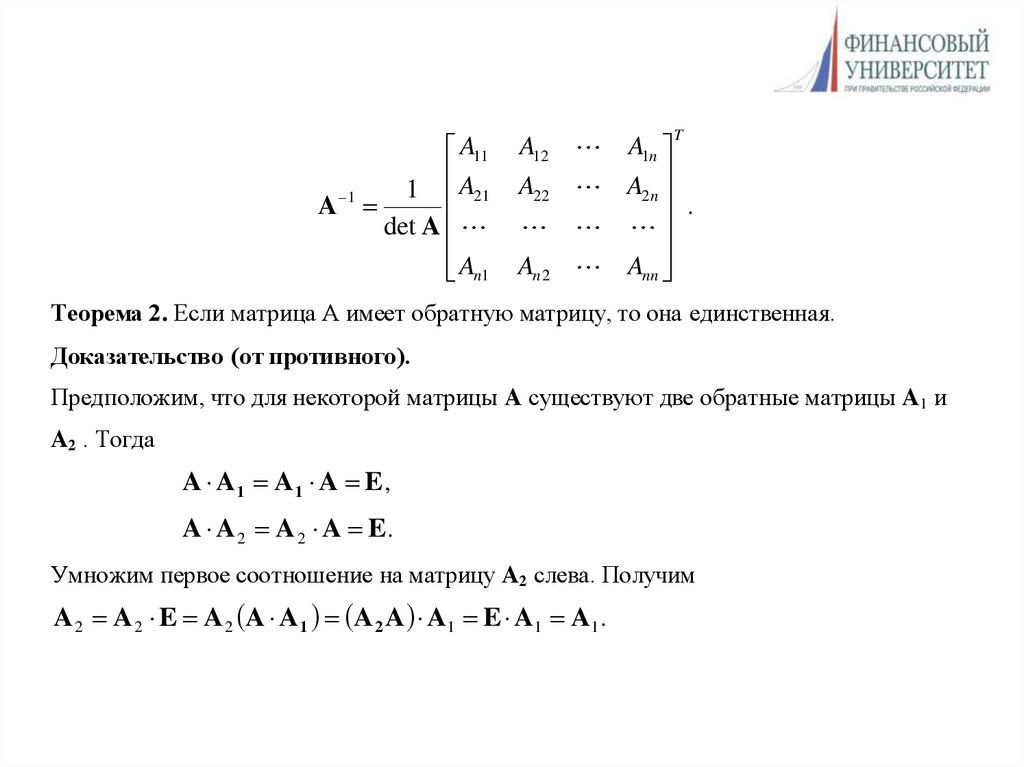 Теорема 2. Если матрица A имеет обратную матрицу, то она единственная.