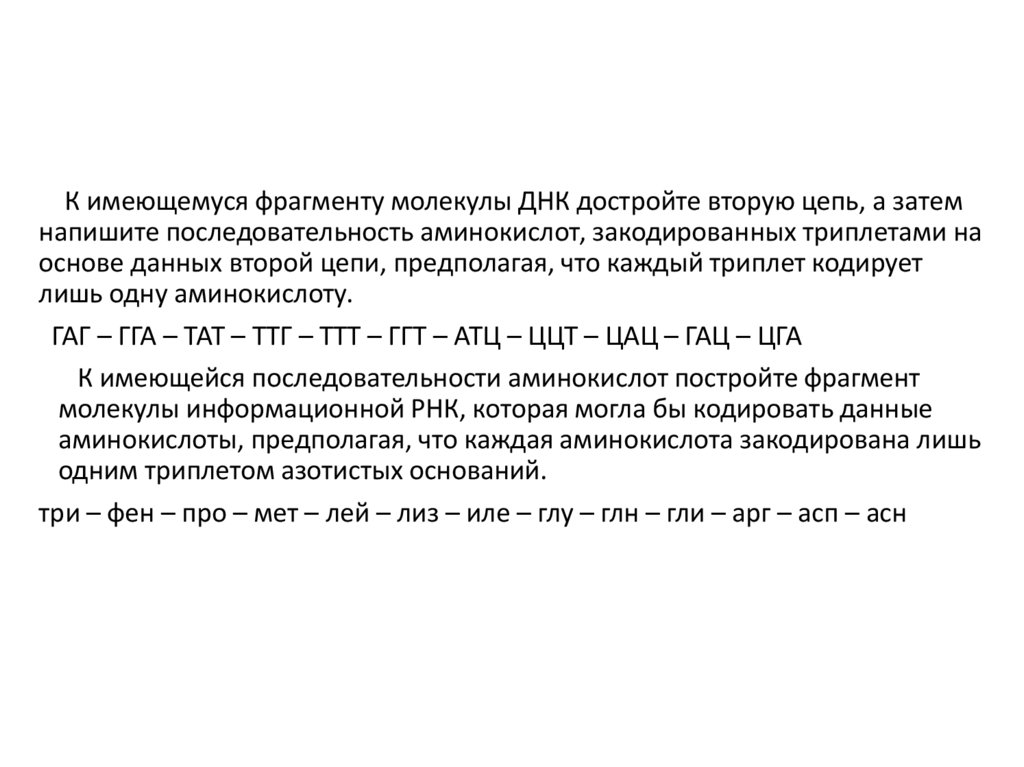 К имеющемуся фрагменту молекулы ДНК достройте вторую цепь, а затемнапишите последовательность аминокислот, закодированных триплетами на