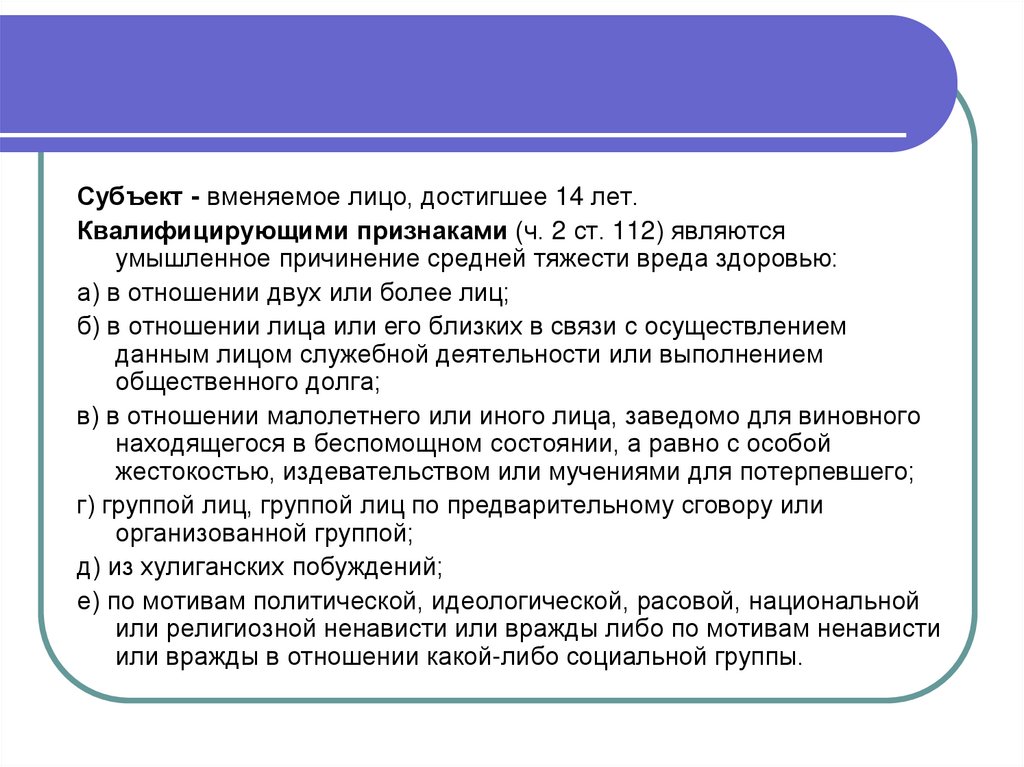 Субъект - вменяемое, достигшее 16 лет лицо, не имеющее высшего