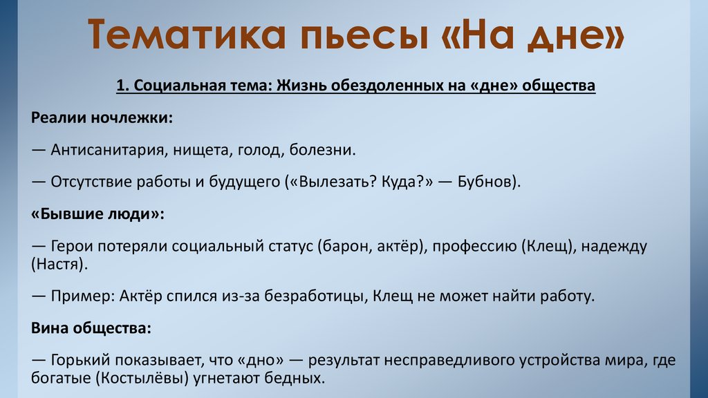 Тематика пьесы «На дне»1. Социальная тема: Жизнь обездоленных на «дне» общества