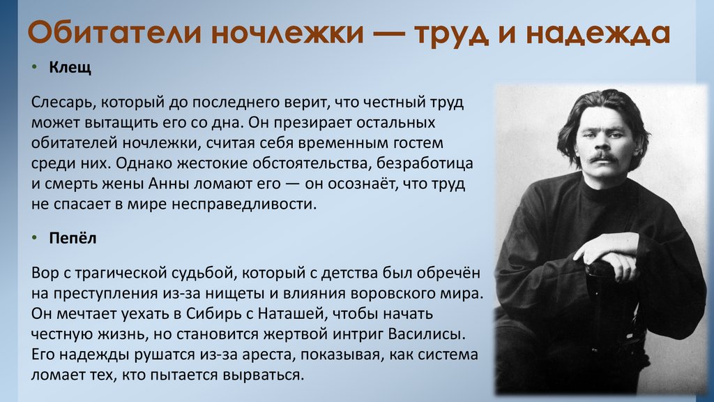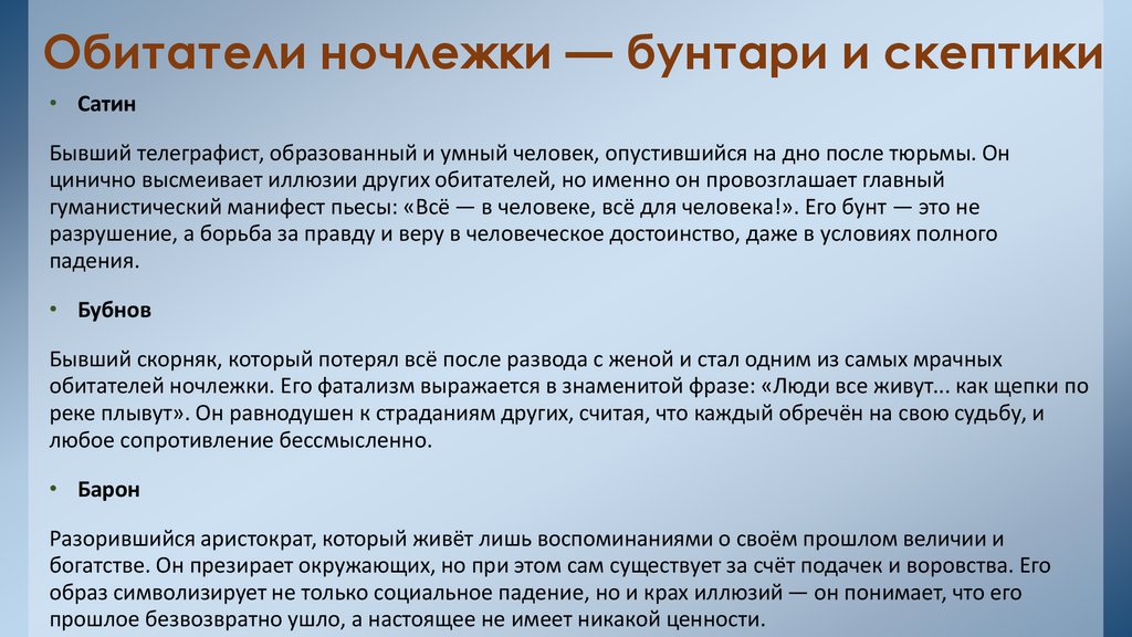 Обитатели ночлежки — бунтари и скептики• Сатин