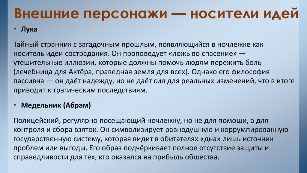 • Обобщение и символичность: ночлежка — это модель общества, где