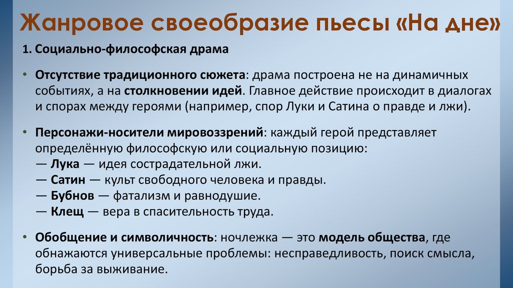 Жанровое своеобразие пьесы «На дне»1. Социально-философская драма