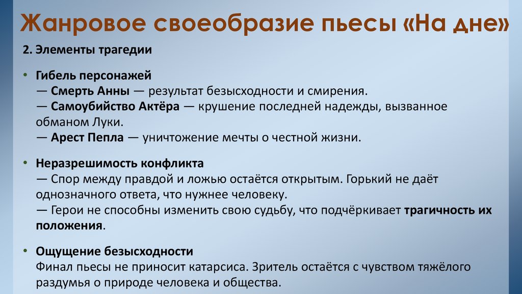 Жанровое своеобразие пьесы «На дне»2. Элементы трагедии