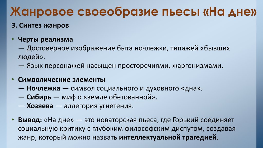• Вывод: «На дне» — это новаторская пьеса, где Горький соединяет