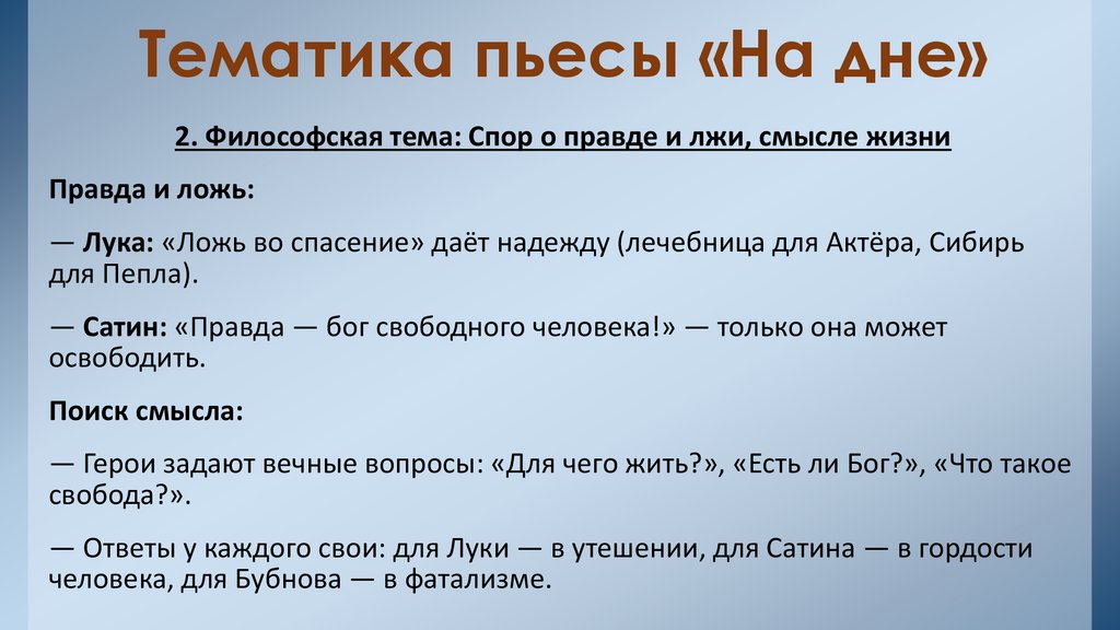 Тематика пьесы «На дне»2. Философская тема: Спор о правде и лжи, смысле жизни