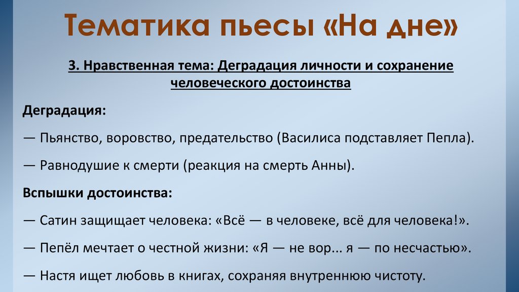 Тематика пьесы «На дне»3. Нравственная тема: Деградация личности и сохранение
