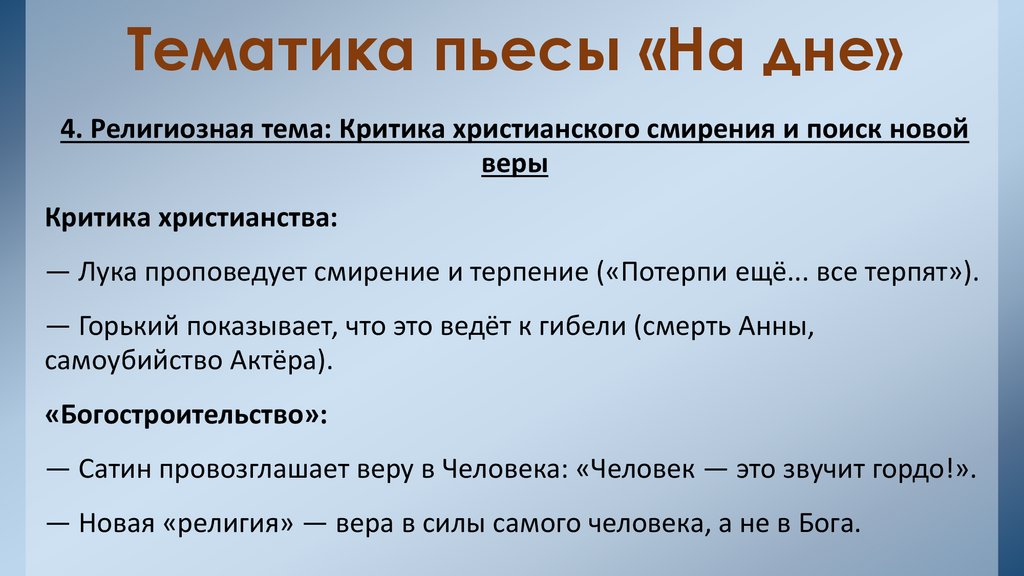 Тематика пьесы «На дне»4. Религиозная тема: Критика христианского смирения и поиск новой