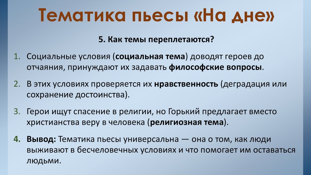 Тематика пьесы «На дне»5. Как темы переплетаются?