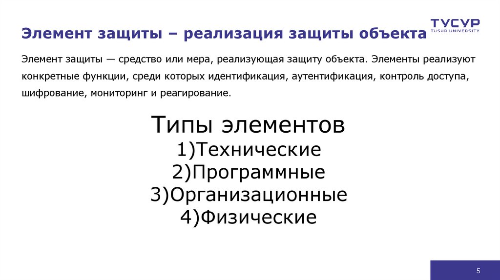 Элемент защиты – реализация защиты объектаЭлемент защиты — средство или мера, реализующая защиту объекта. Элементы реализуют