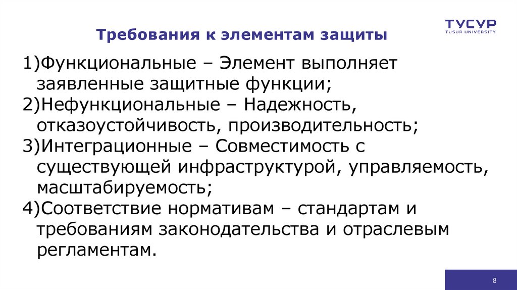 Требования к элементам защиты1)Функциональные – Элемент выполняет