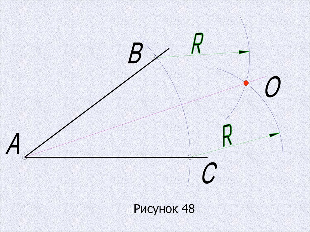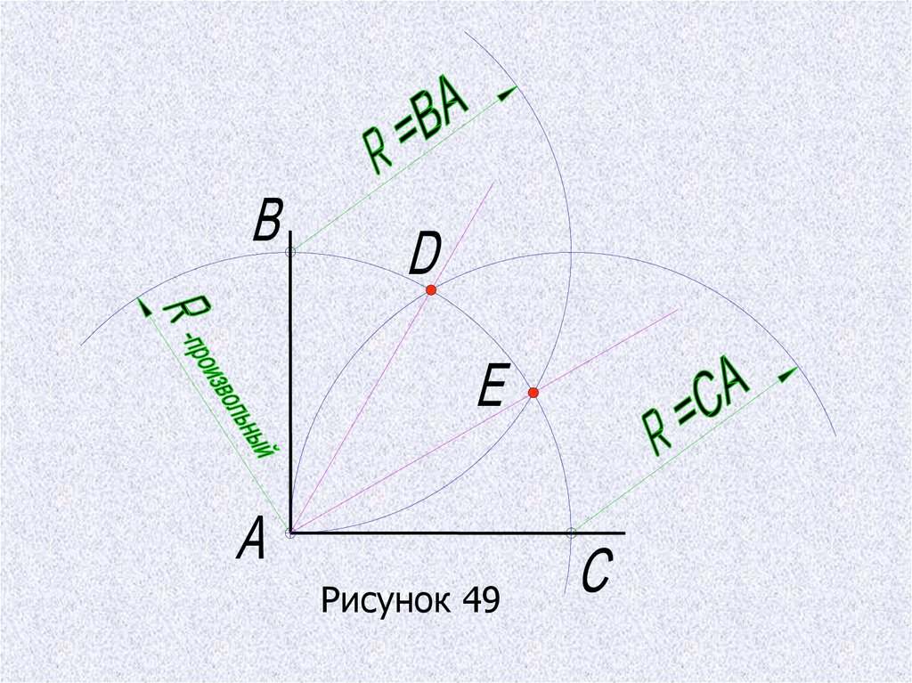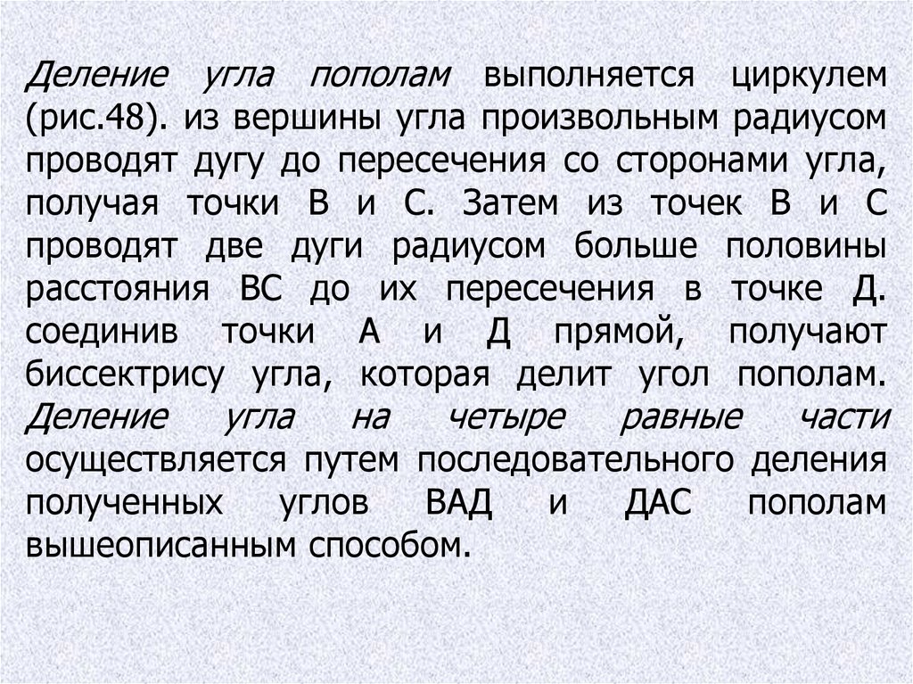 Деление угла пополам выполняется циркулем(рис.48). из вершины угла произвольным радиусом