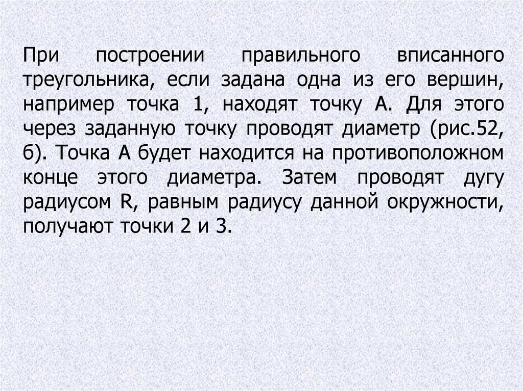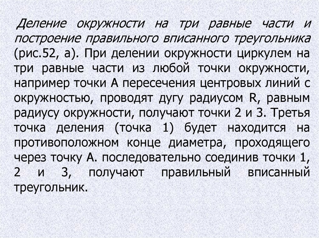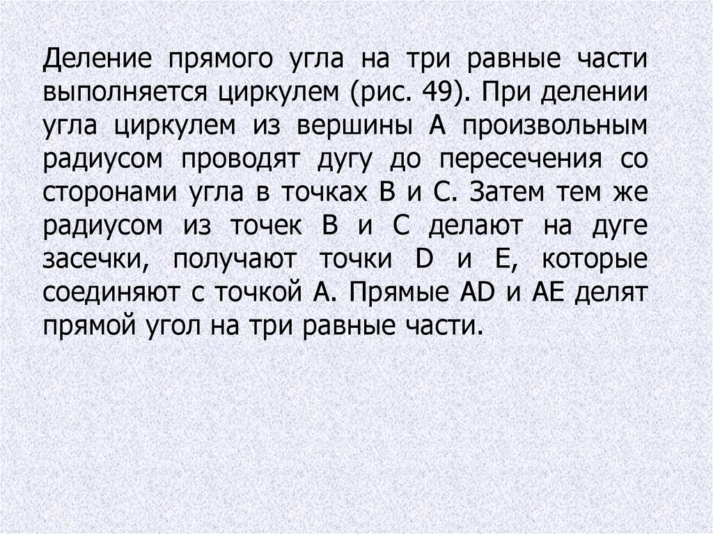 Деление прямого угла на три равные частивыполняется циркулем (рис. 49). При делении