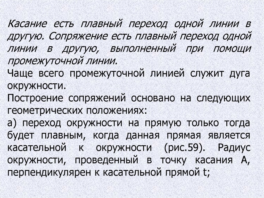 Касание есть плавный переход одной линии вдругую. Сопряжение есть плавный переход одной