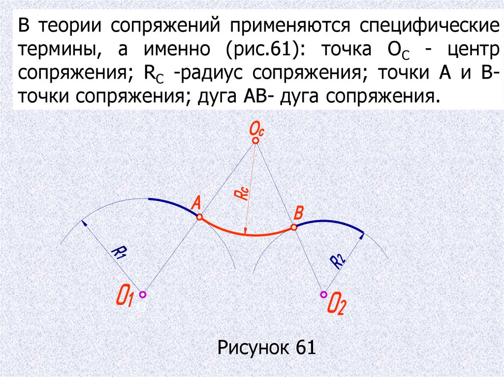 В теории сопряжений применяются специфическиетермины, а именно (рис.61): точка ОС - центр