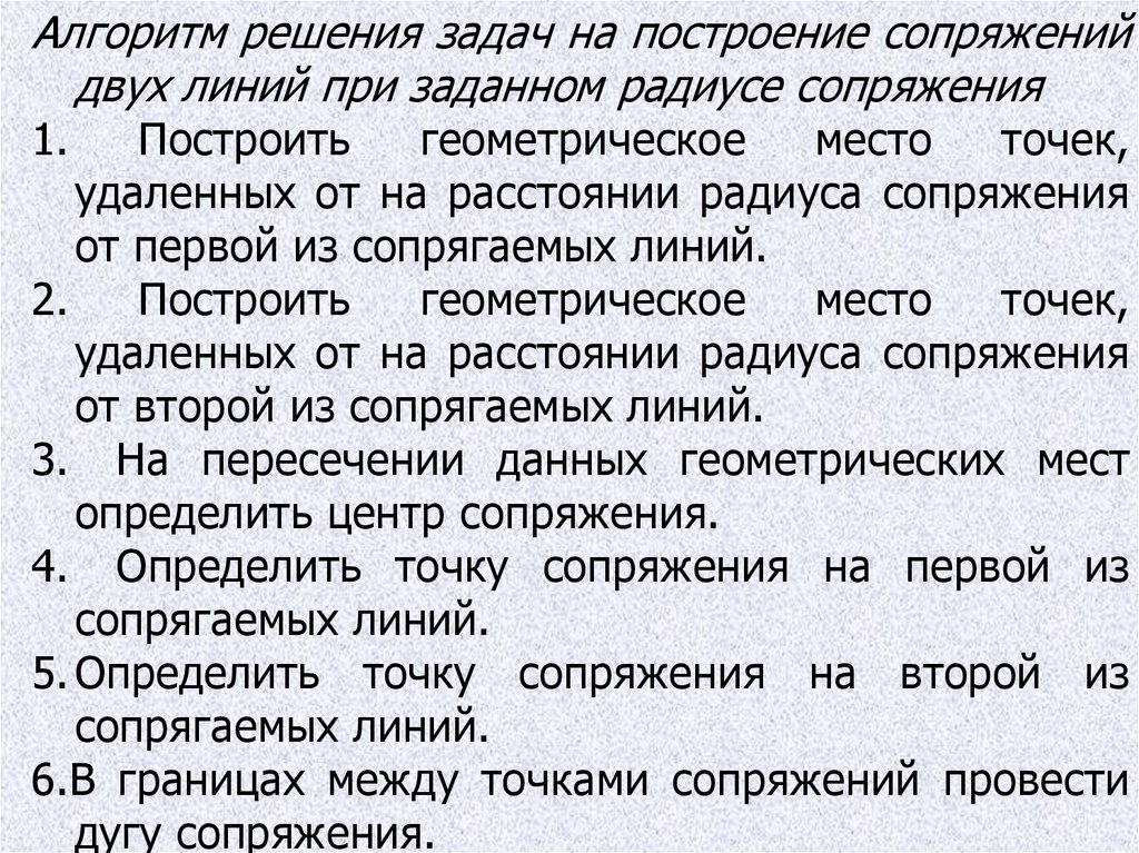 Алгоритм решения задач на построение сопряженийдвух линий при заданном радиусе сопряжения