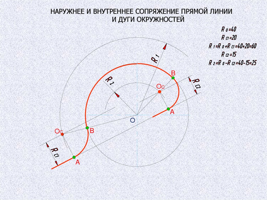 НАРУЖНЕЕ И ВНУТРЕННЕЕ СОПРЯЖЕНИЕ ПРЯМОЙ ЛИНИИИ ДУГИ ОКРУЖНОСТЕЙ