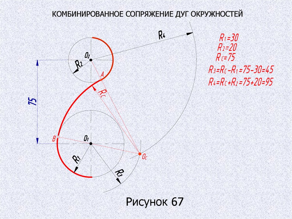 КОМБИНИРОВАННОЕ СОПРЯЖЕНИЕ ДУГ ОКРУЖНОСТЕЙРисунок 67