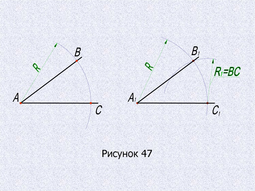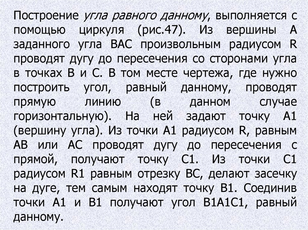 Построение угла равного данному, выполняется спомощью циркуля (рис.47). Из вершины А