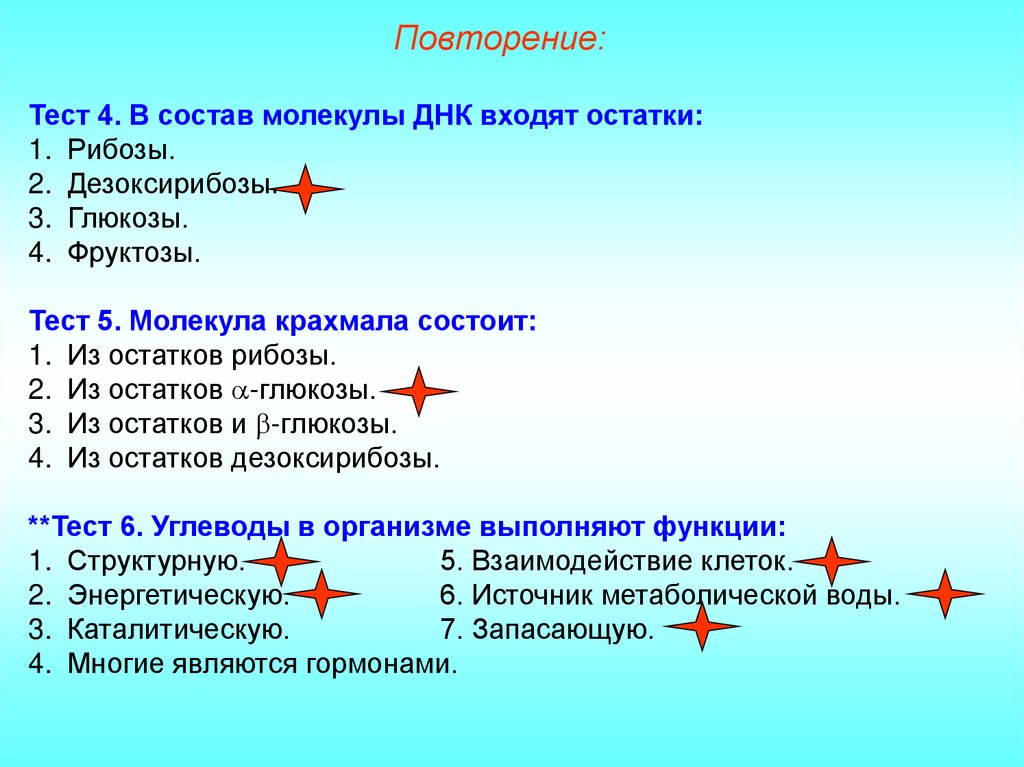 Повторение:Тест 4. В состав молекулы ДНК входят остатки:
