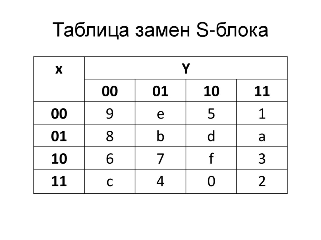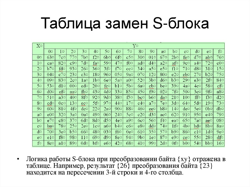 Таблица замен S-блока• Логика работы S-блока при преобразовании байта {xy} отражена в