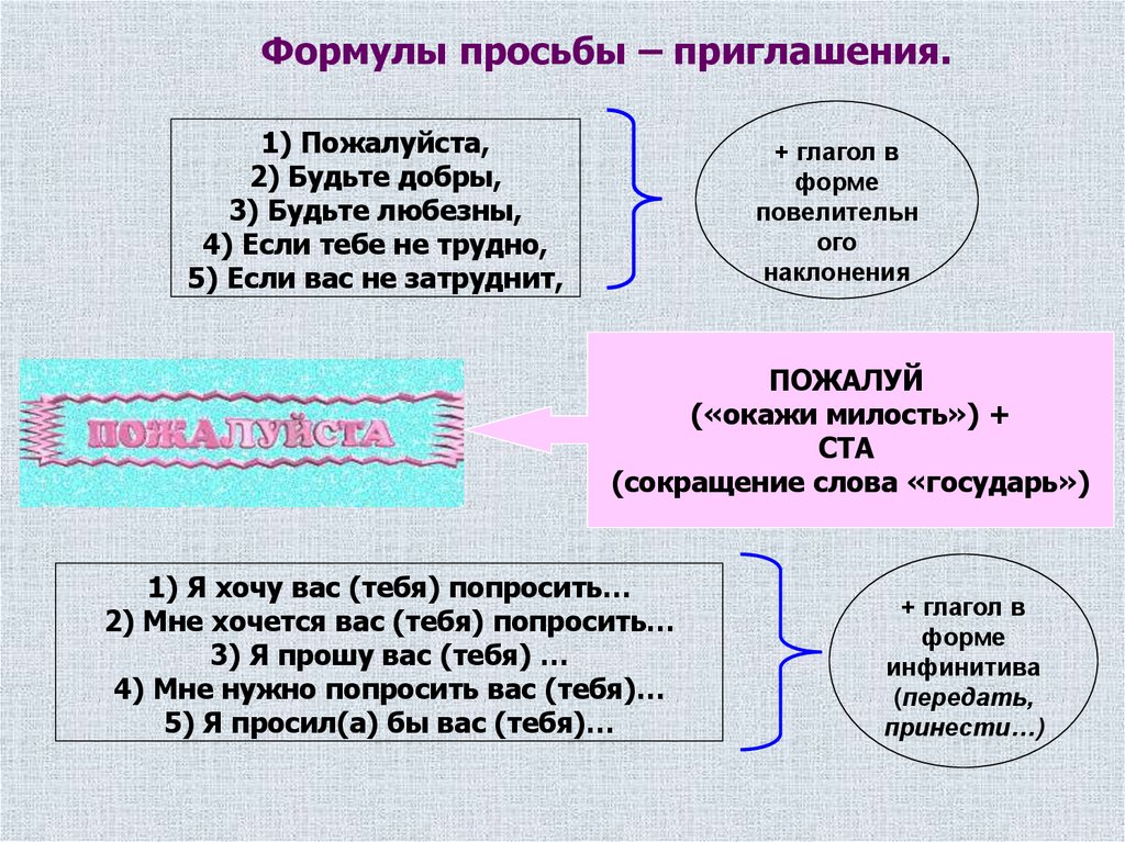Формулы просьбы – приглашения.1) Пожалуйста,