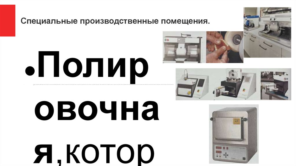 Полимеризационная, где проводят подготовку полимер-мономерной смеси, паковку, прессование и полимеризацию. Здесь устанавливают специальные металлические аппараты для выплавления воска, а также автоматизированные приборы для полимеризации пластмасс под давлением. В том случае если полимеризацию проводят в условиях влажной среды, непосредственно над этой аппаратурой устанавливают вытяжной зонд вентиляционной системы, а стены по периметру аппаратуры облицовывают кафельной плиткой.
